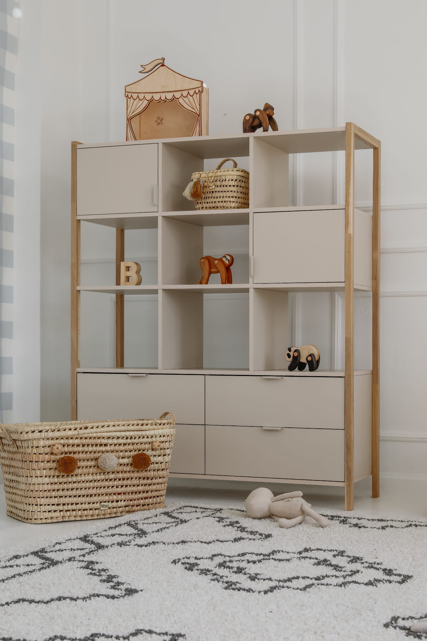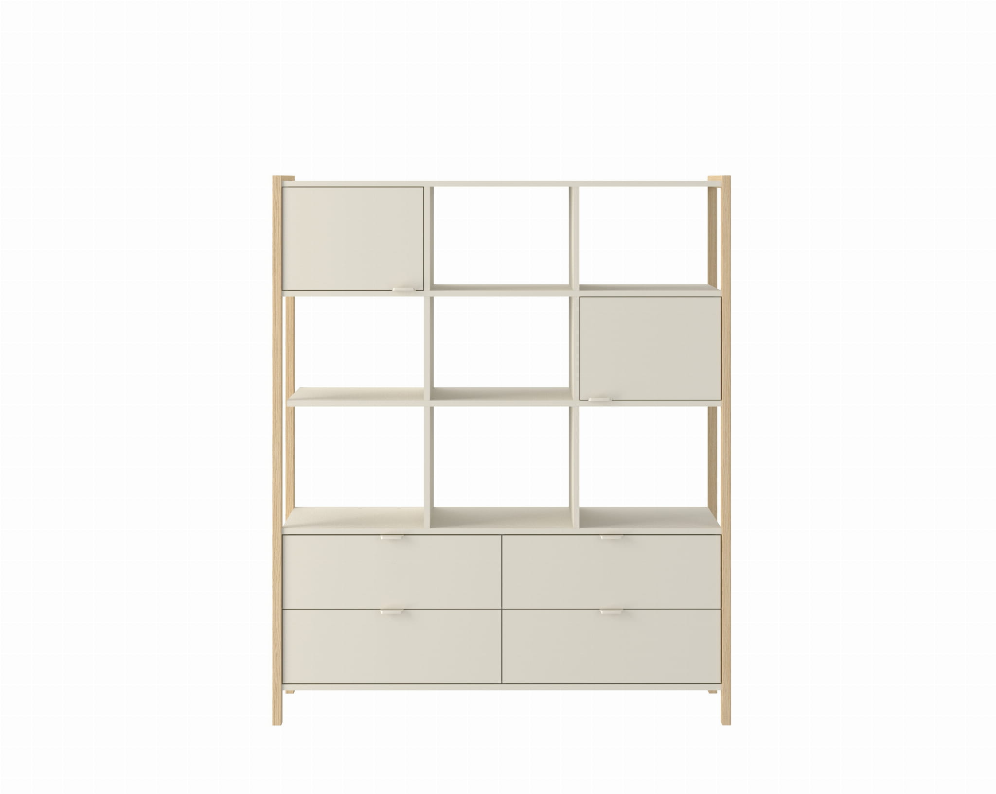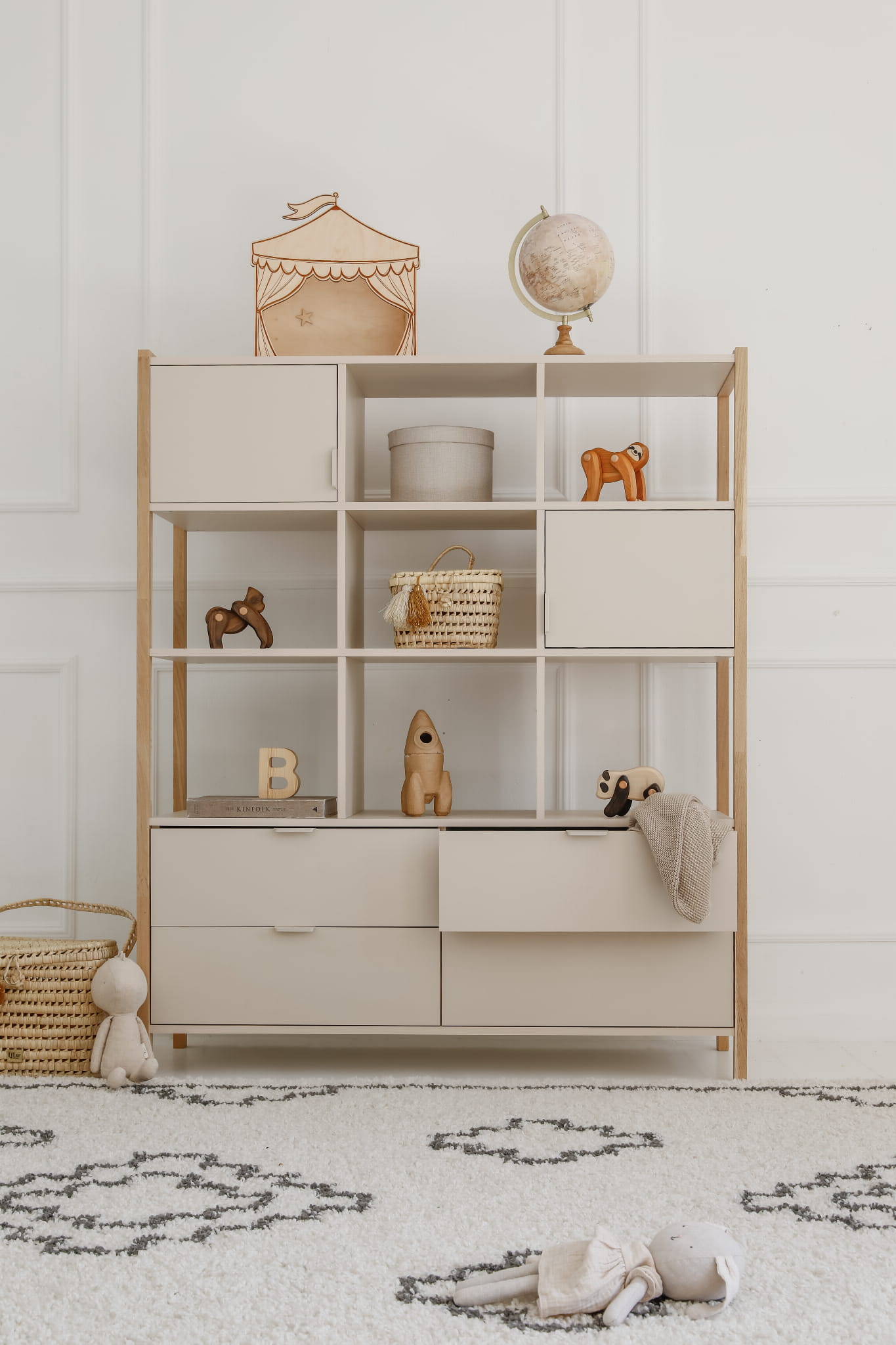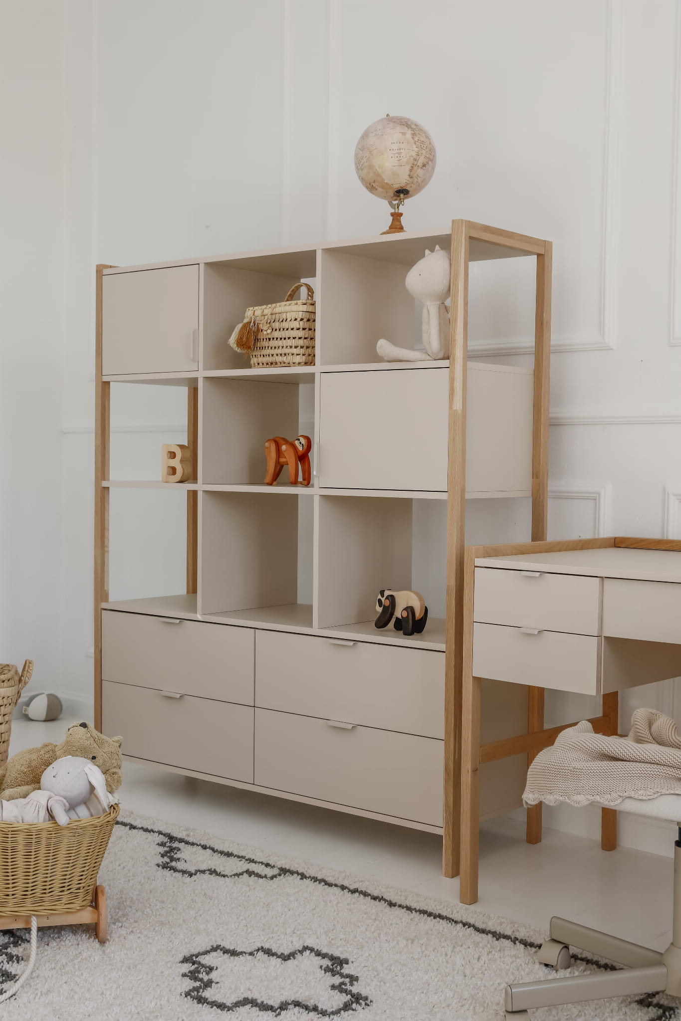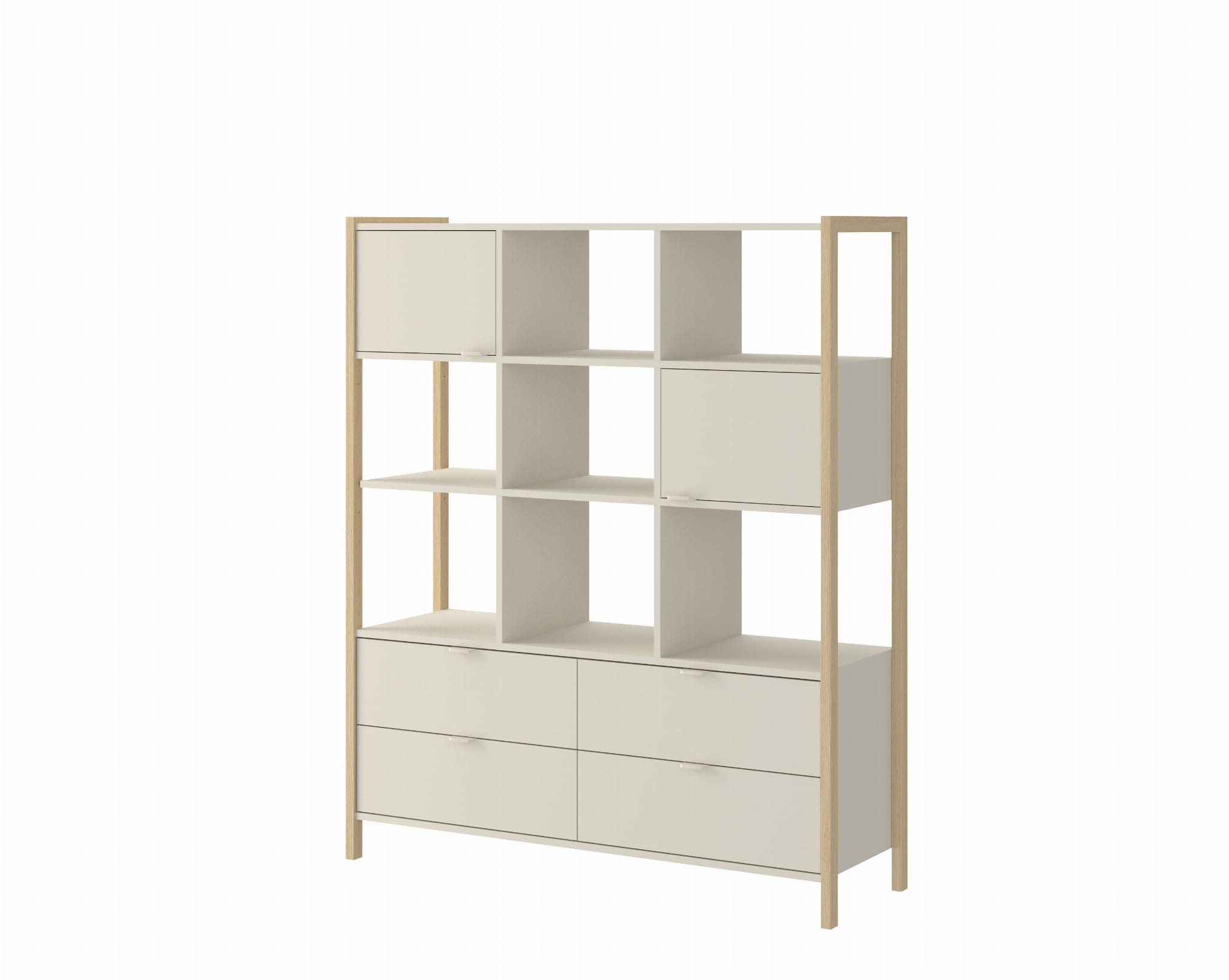 Wyposażony w cztery pojemne szuflady, dwie zamykane szafki oraz otwarte półki, pozwala na wygodne uporządkowanie książek,