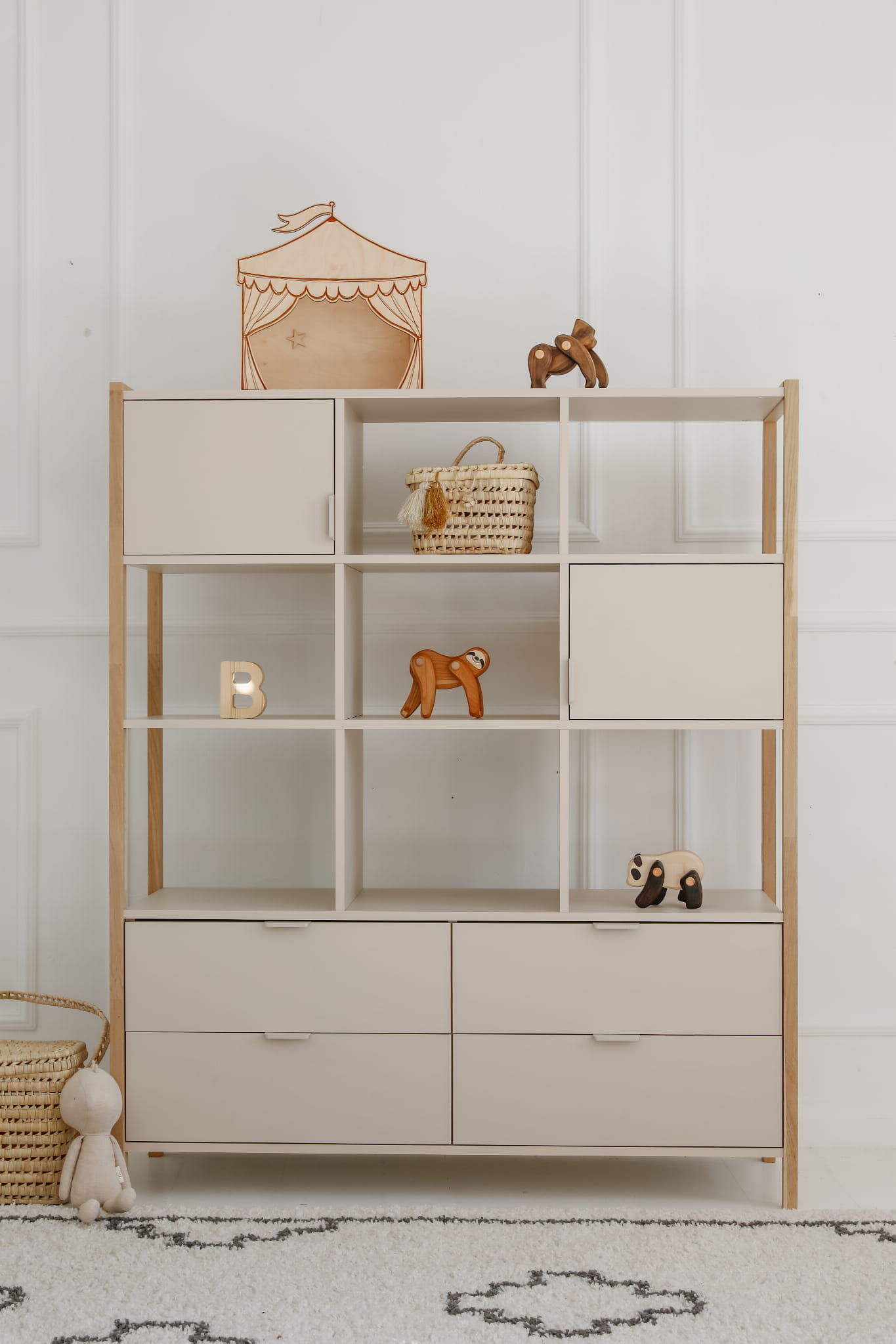 - Bezpieczeństwo – możliwość przymocowania regału do ściany, stabilna podstawa na drewnianych nogach.