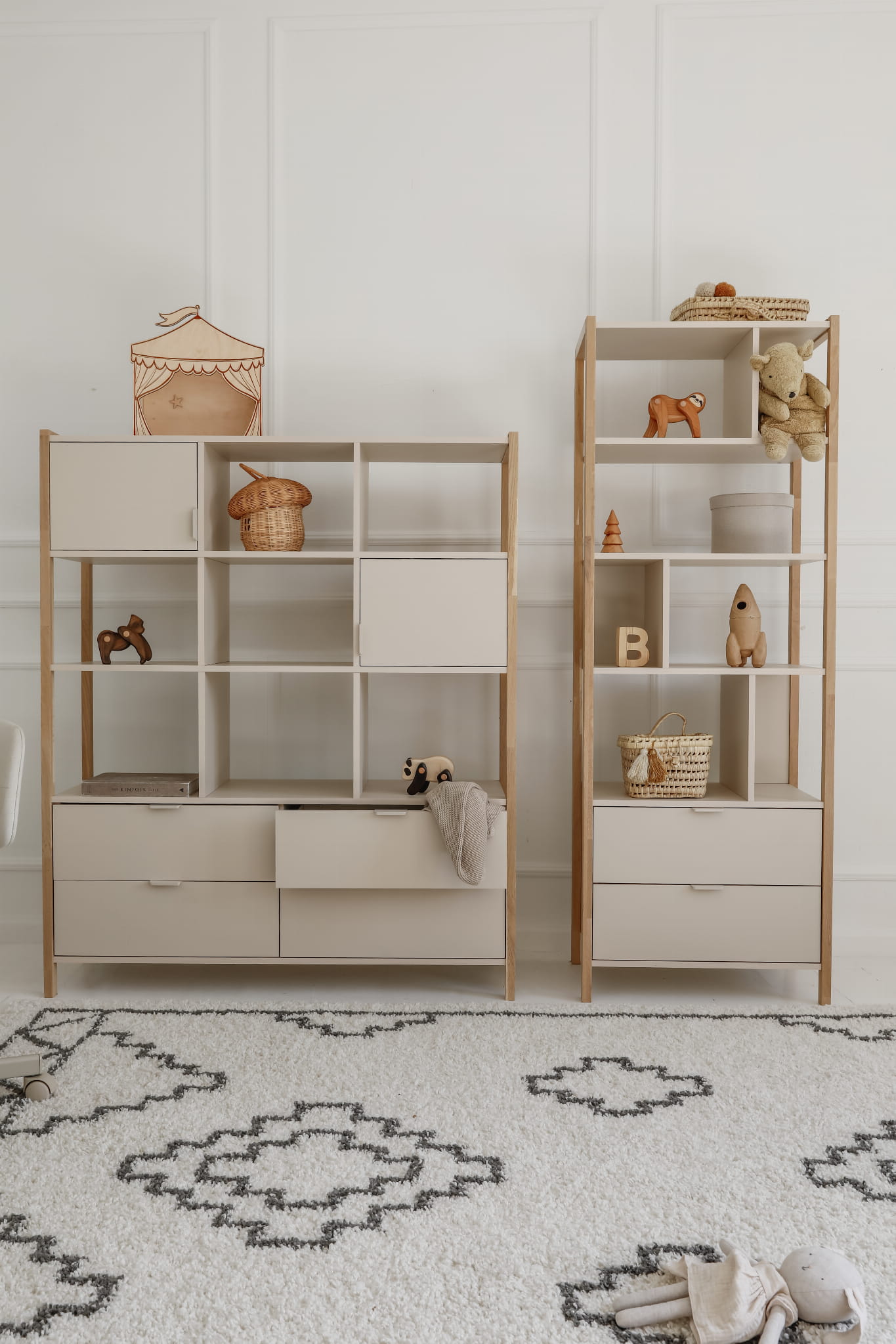 - Praktyczna organizacja przestrzeni – cztery szuflady, dwie zamykane szafki i otwarte półki.