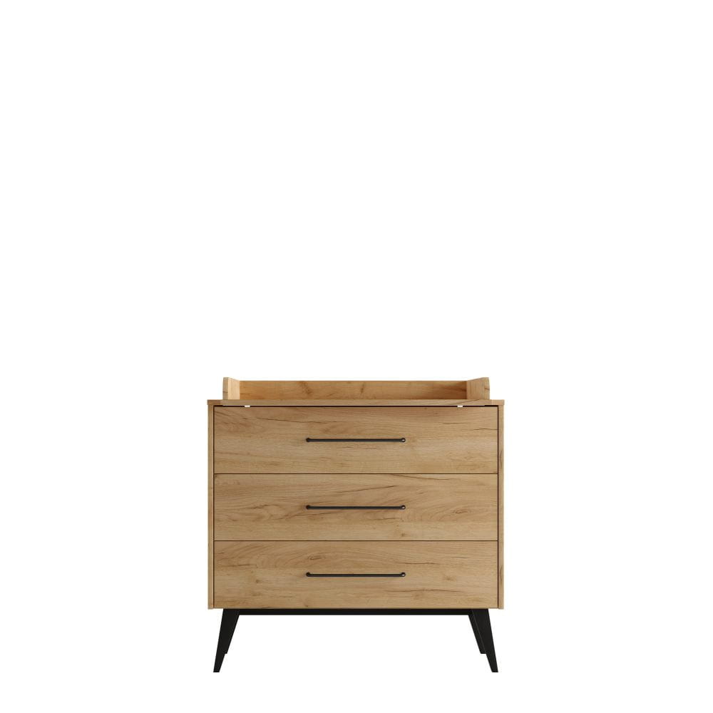 Komoda została precyzyjnie wykonana z laminowanej płyty wiórowej (grubość #18 mm) oraz solidnego drewna bukowego służącego jako nóżki.