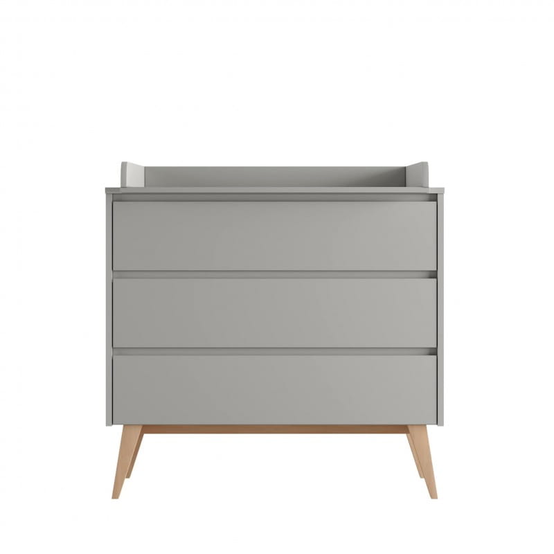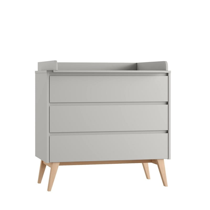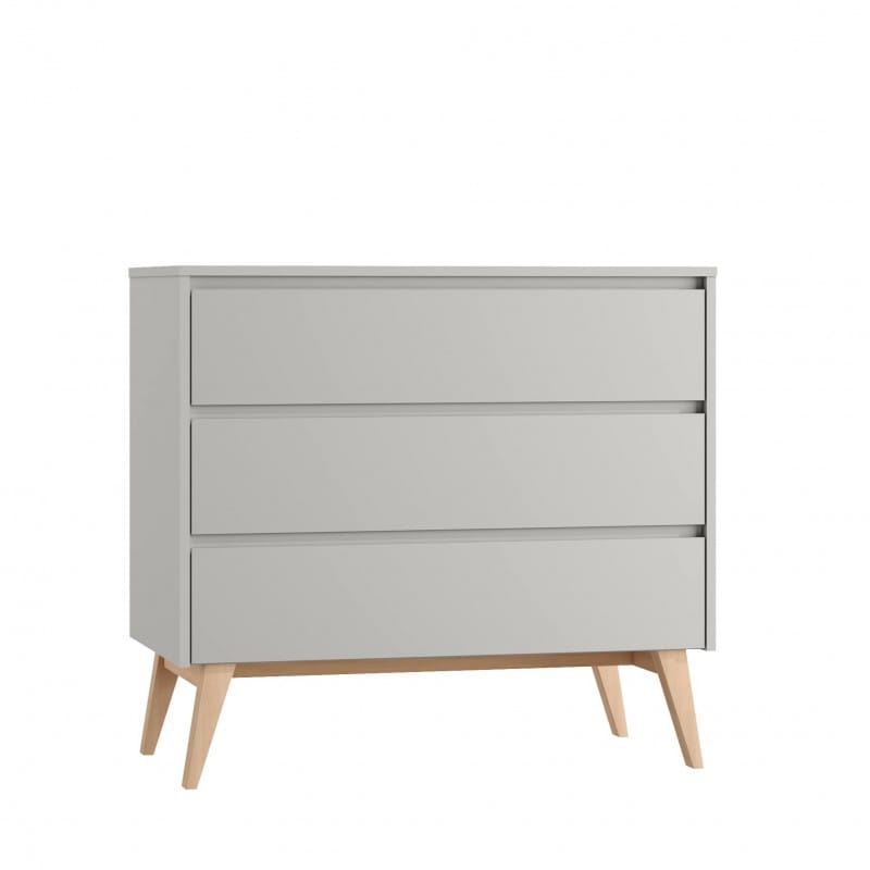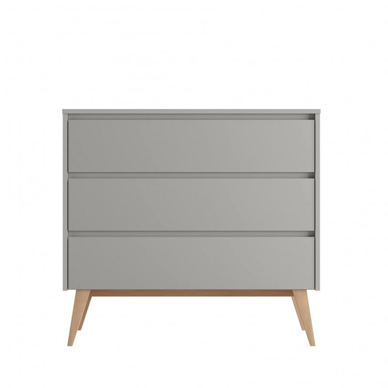 Komoda wykonana jest z malowanej płyty MDF, płyty laminowanej (korpus, elementy wewnętrzne) oraz z litego drewna bukowego
